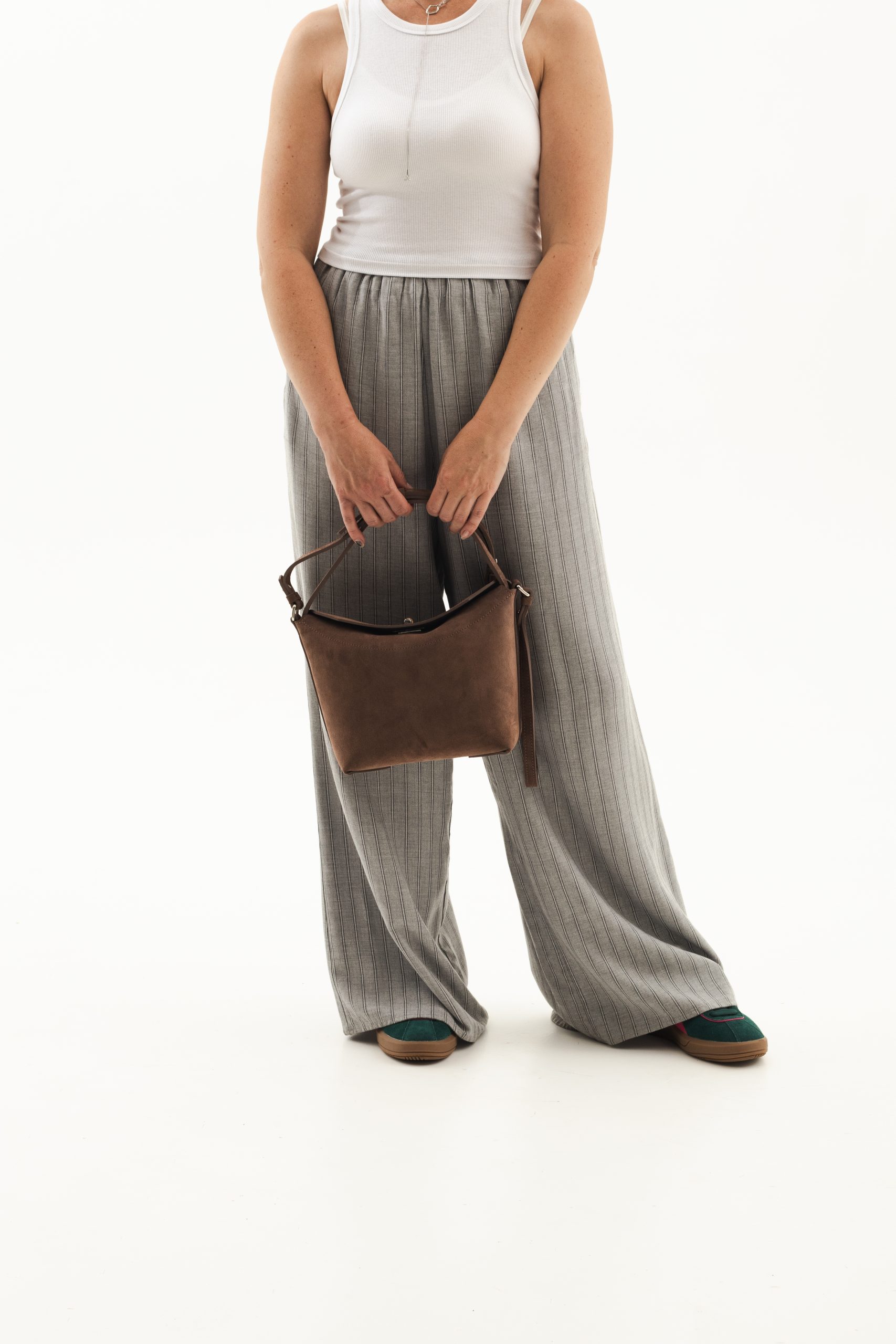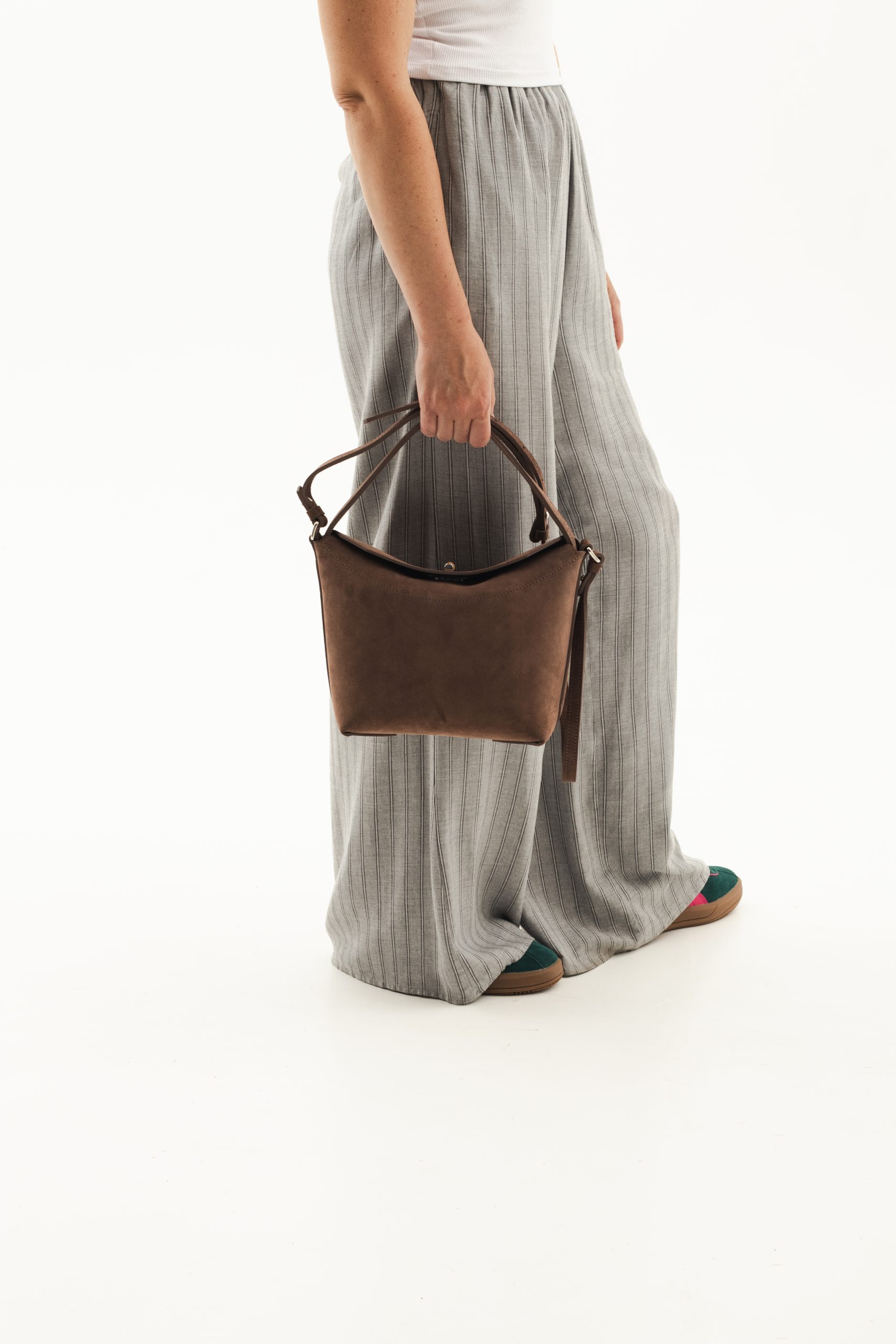 E S K E – a bag that makes you fall in love at first sight. Simplicity. Soft texture. A shape that does not need words. Swivel clasp with a wooden insert. The strap is adjustable in length. Made of natural suede. A spacious inner compartment and a pocket add convenience to this accessory.