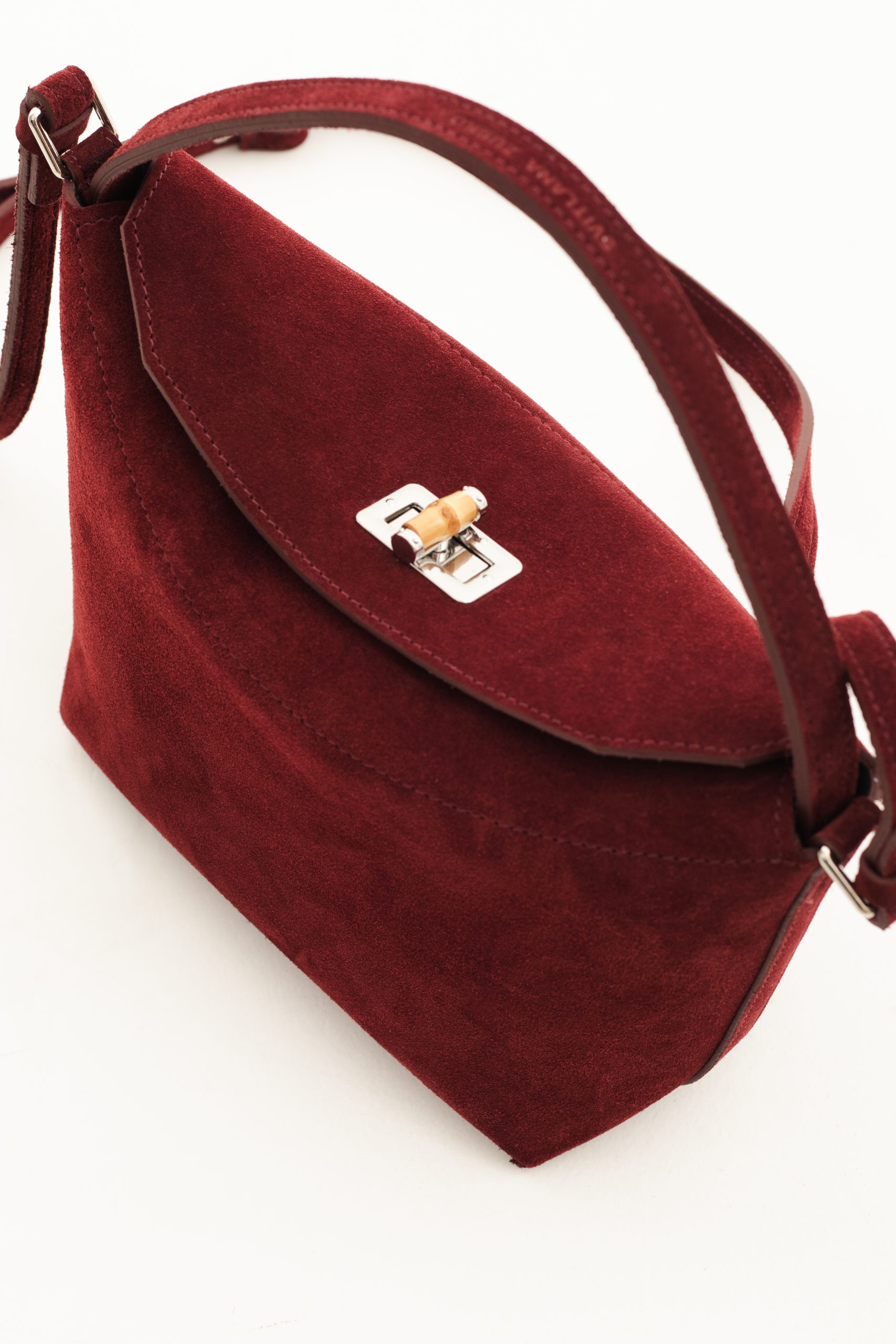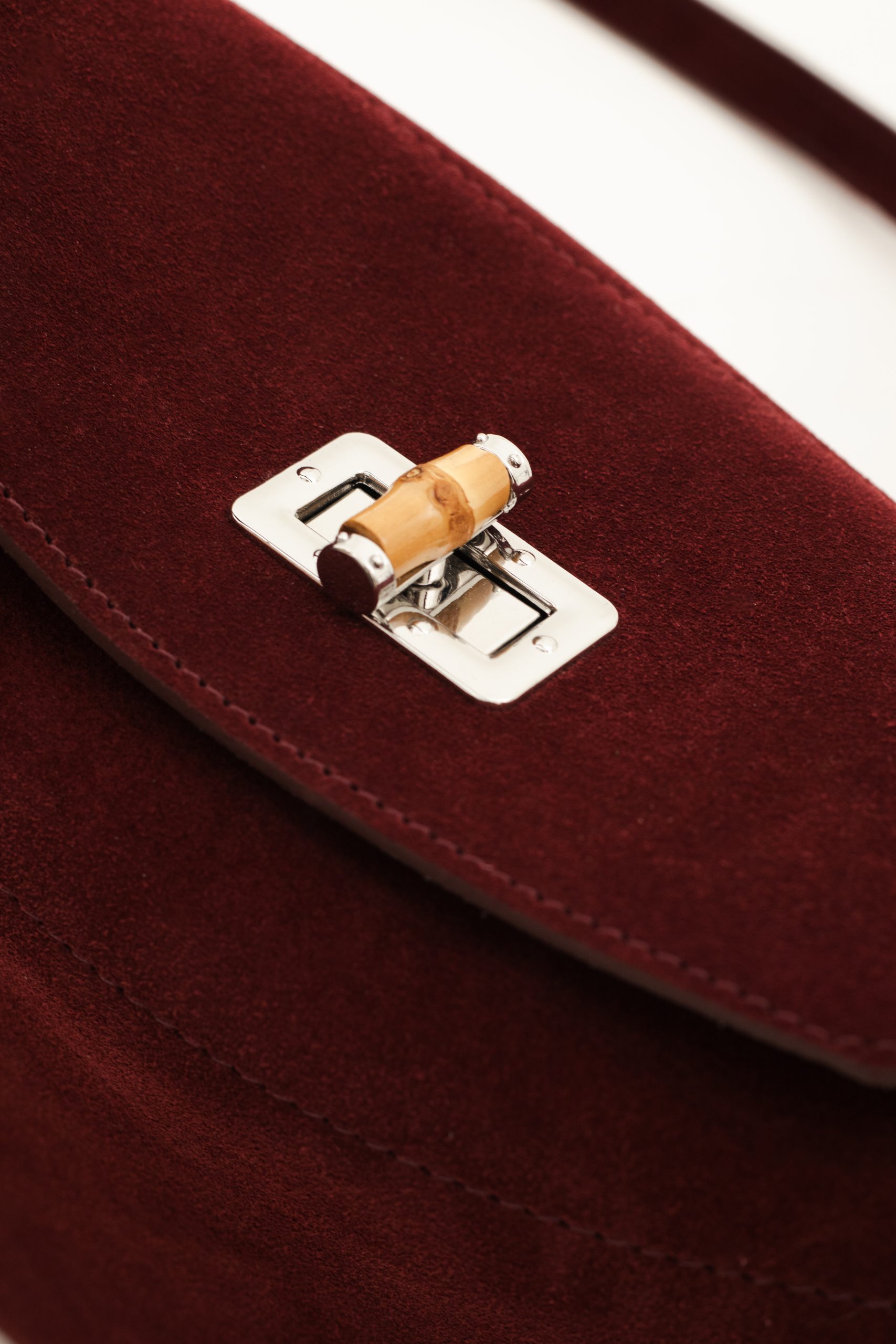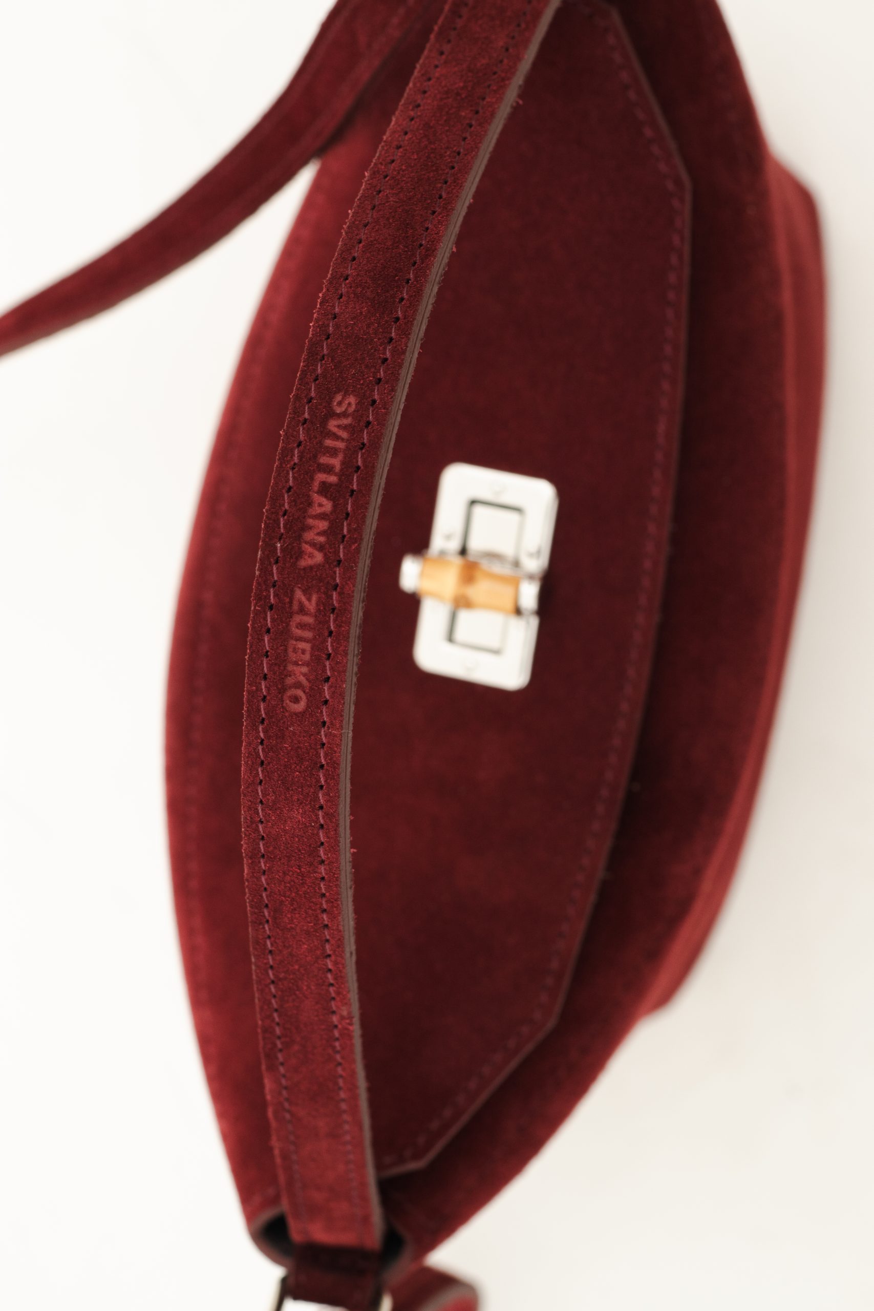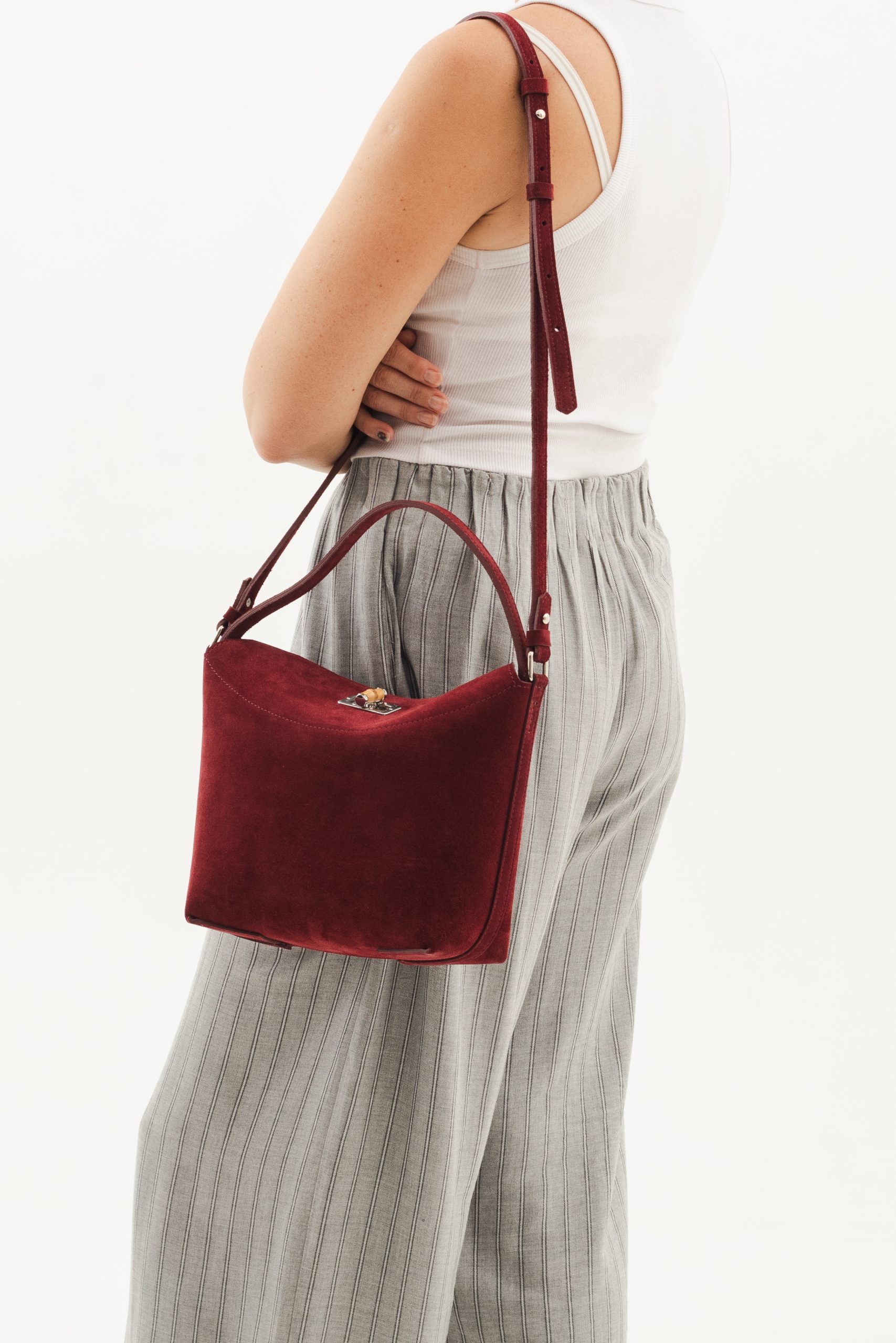 E S K E – a bag that makes you fall in love at first sight. Simplicity. Soft texture. A shape that does not need words. Swivel clasp with a wooden insert. The strap is adjustable in length. Made of natural suede. A spacious inner compartment and a pocket add convenience to this accessory.