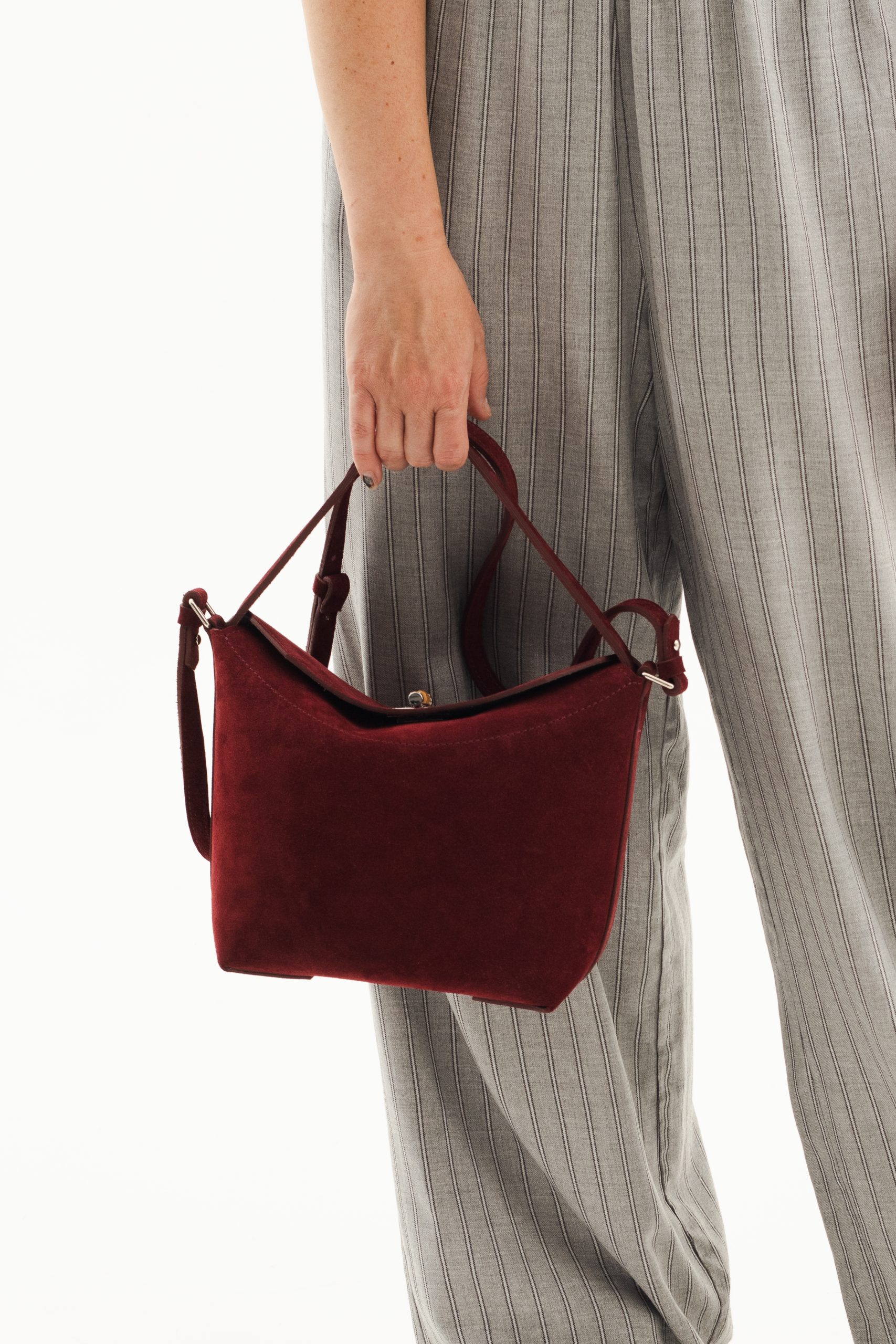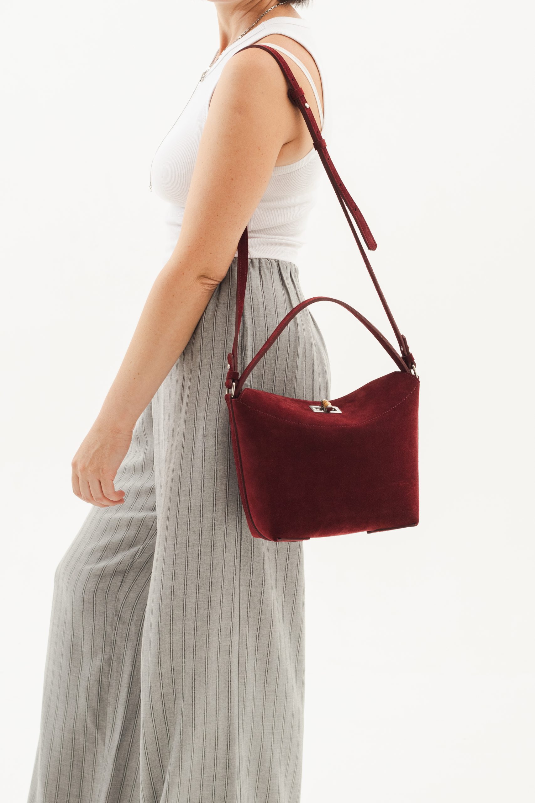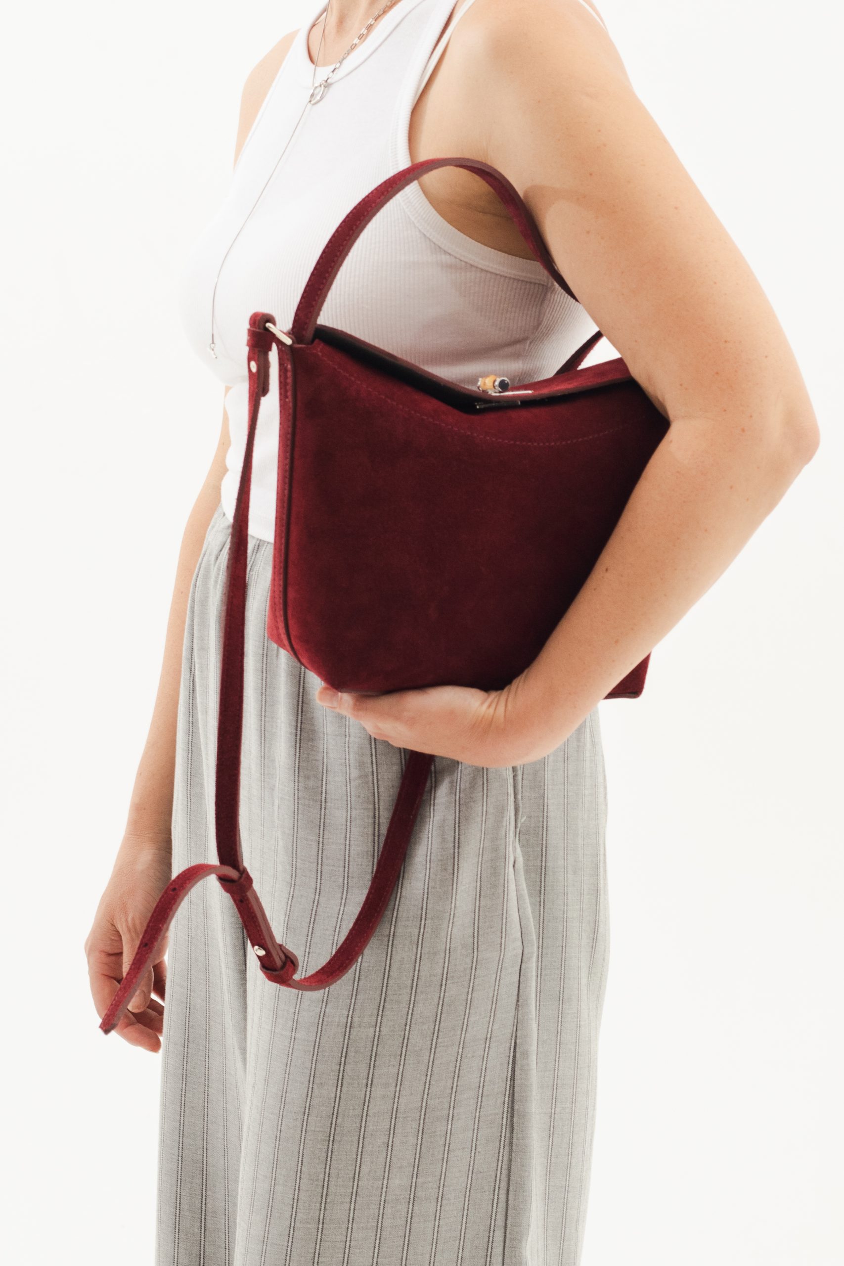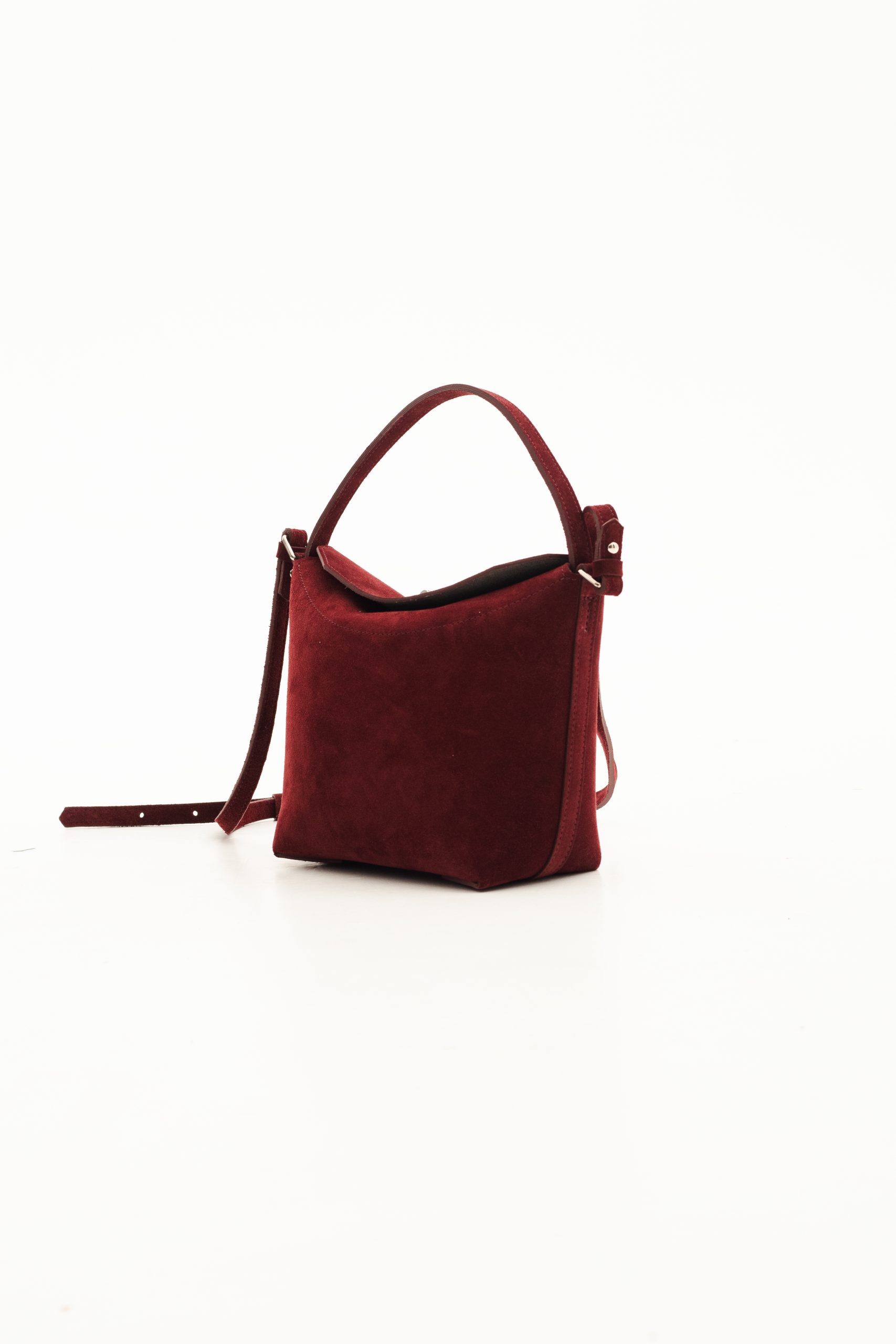 E S K E – a bag that makes you fall in love at first sight. Simplicity. Soft texture. A shape that does not need words. Swivel clasp with a wooden insert. The strap is adjustable in length. Made of natural suede. A spacious inner compartment and a pocket add convenience to this accessory.