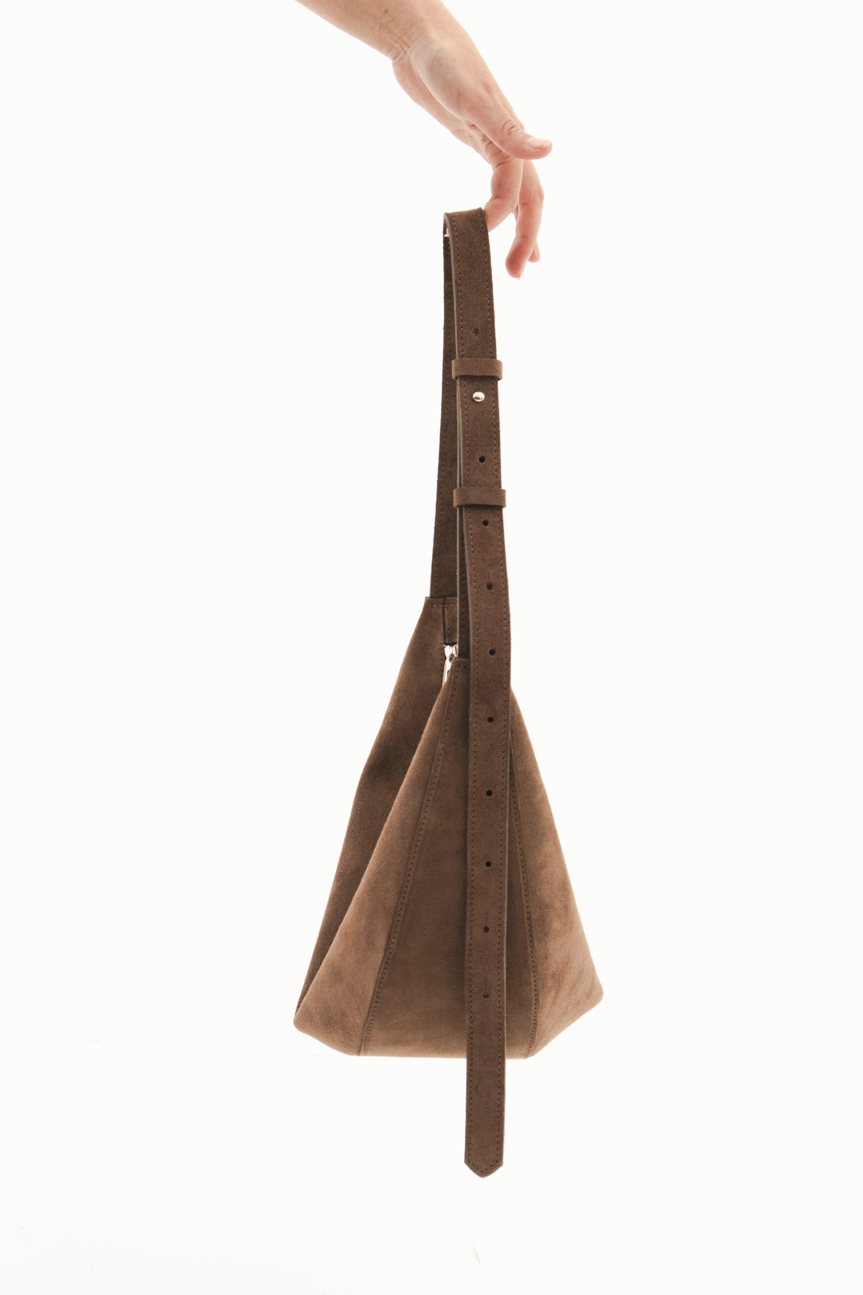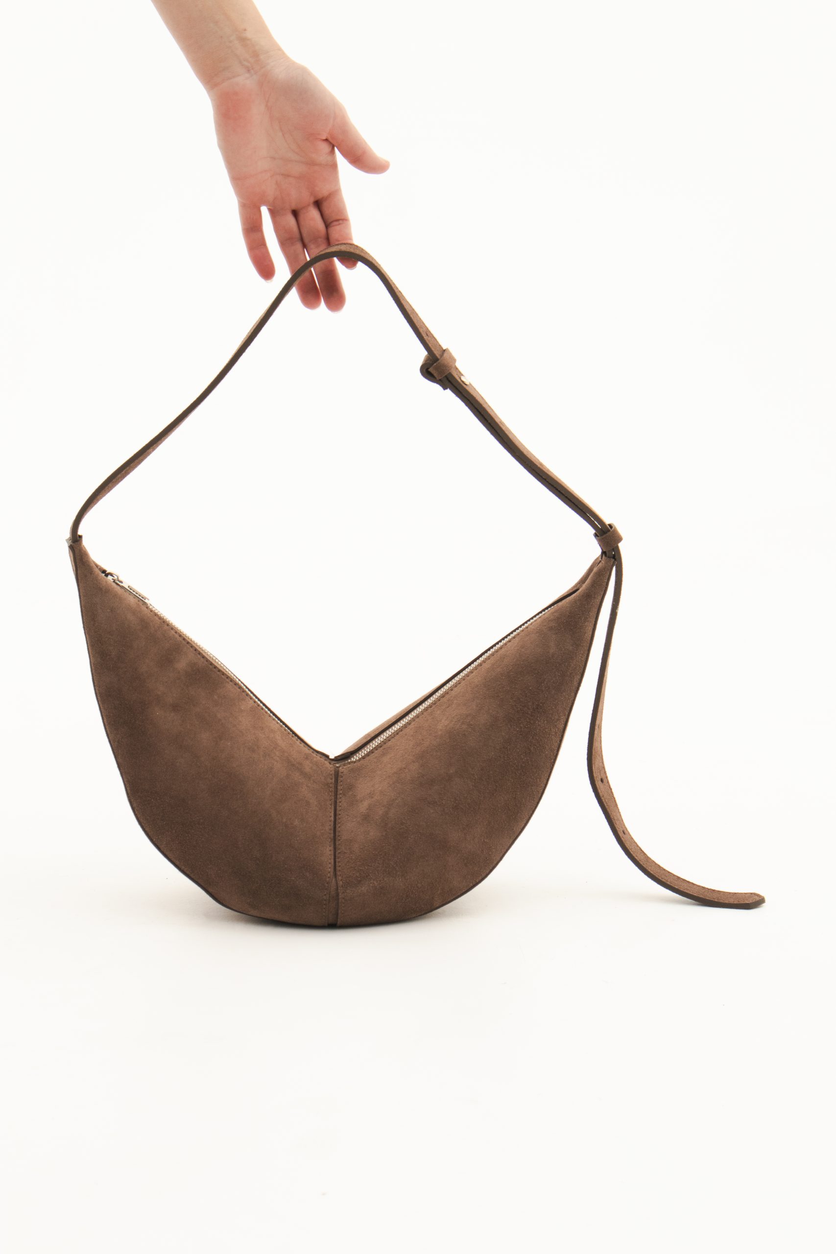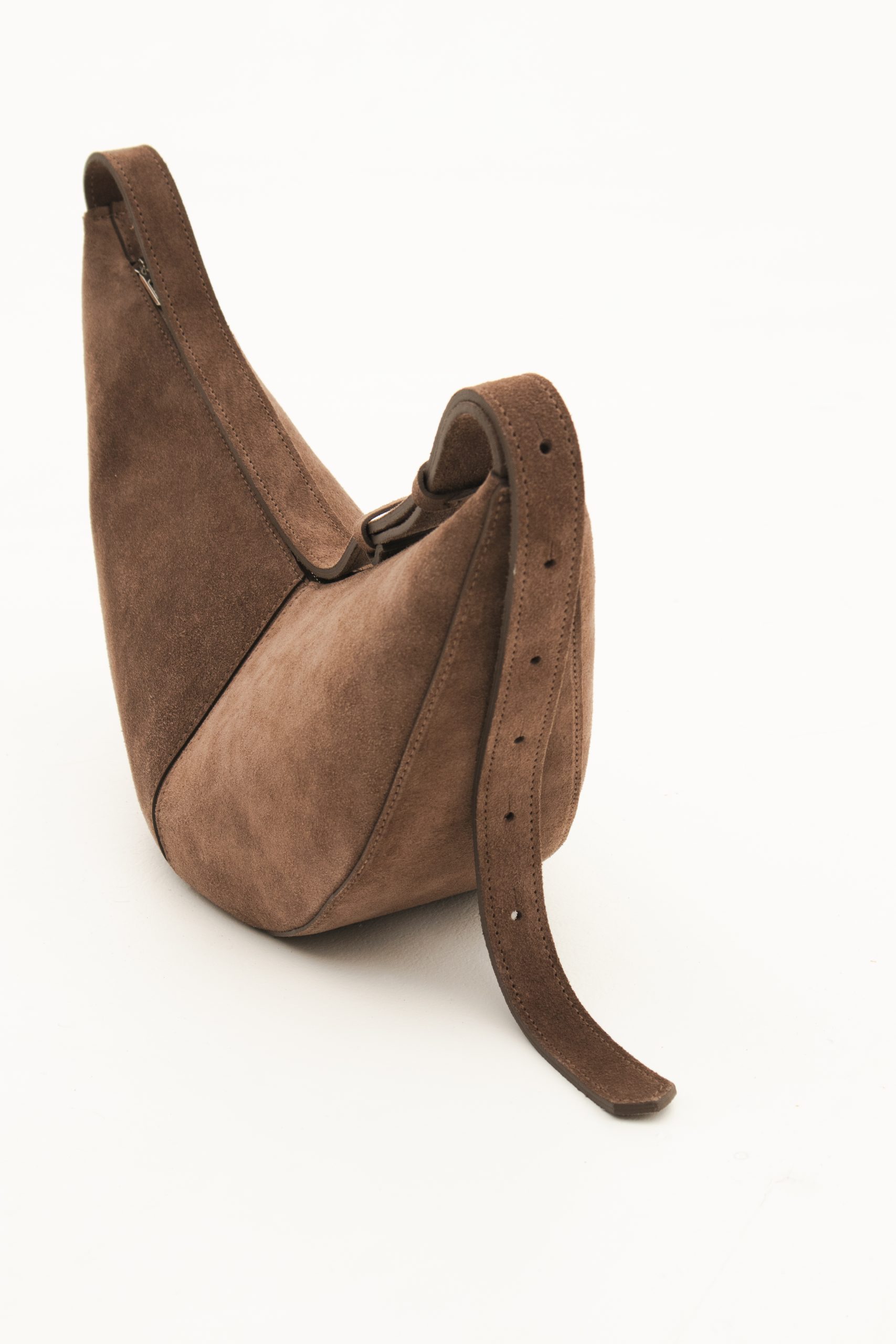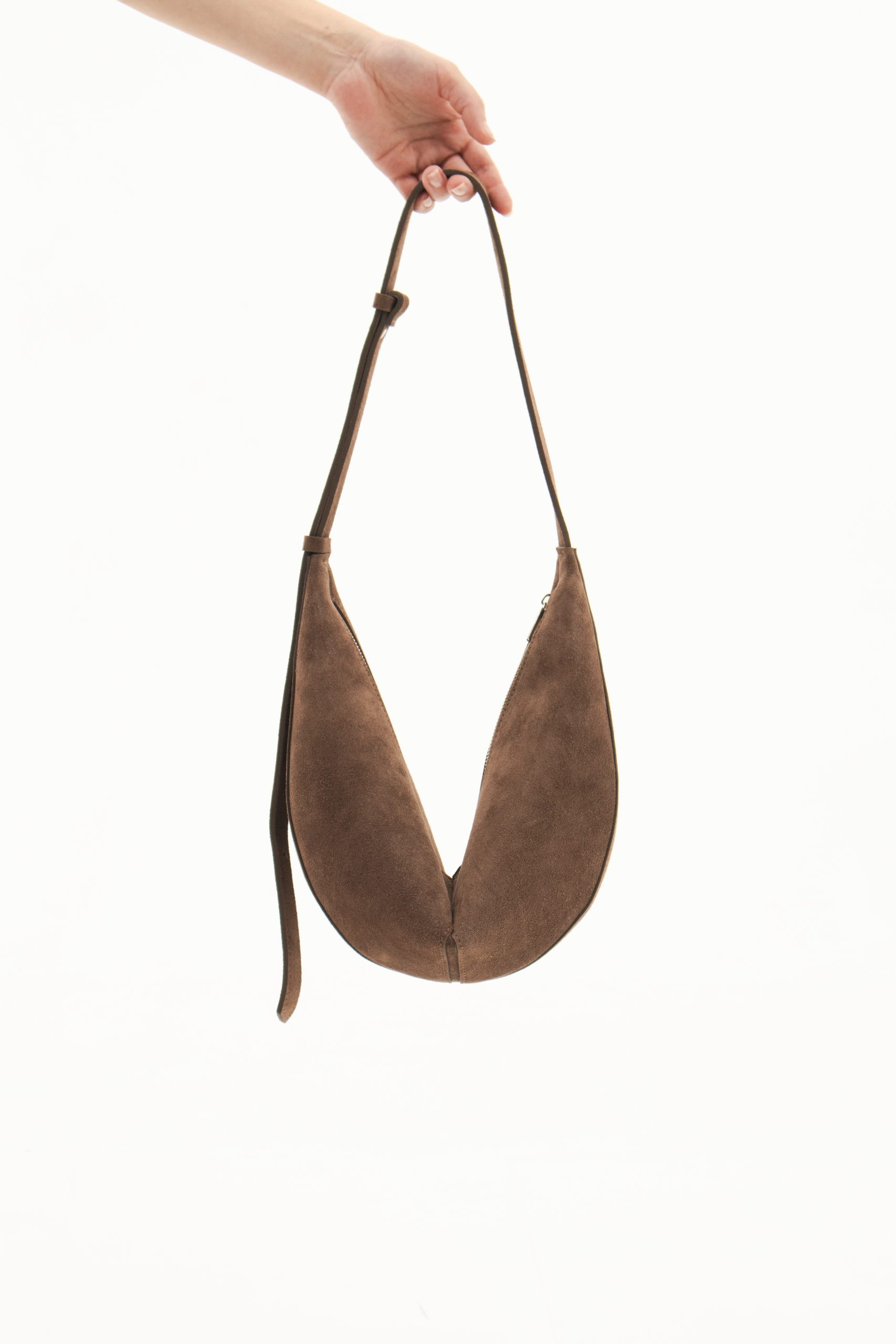 MARAMA bag – clean lines, soft texture, calm in shape. Created to remain in memory. Sling bag with soft lining and zipper closure. Thanks to its shape, it easily adapts to your body. The strap is adjustable in length. Made of natural suede. A spacious internal compartment and pocket add convenience to this accessory.