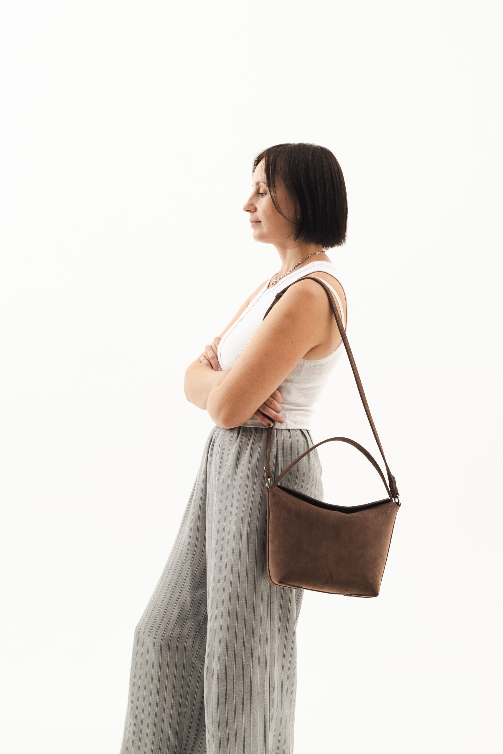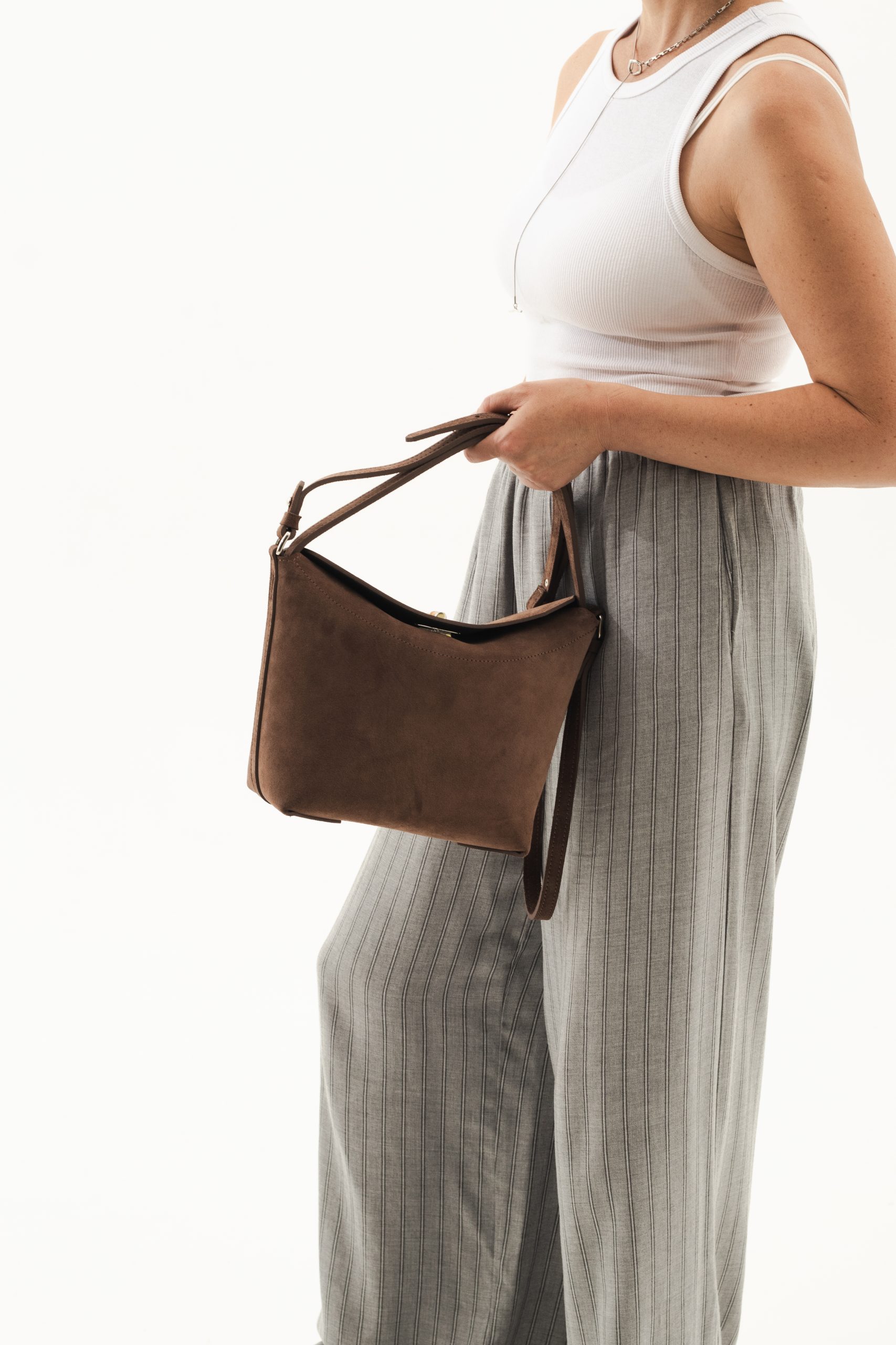 E S K E – cумка,яка закохує з першого погляду. Простота. М’яка текстура. Форма, що не потребує слів. Поворотна застібка з дерев’яною вставкою. Ремінець регулюється по довжині. Виготовлена з натуральної замші. Просторий внутрішній відділ та кишеня додають зручності цьому аксесуару.