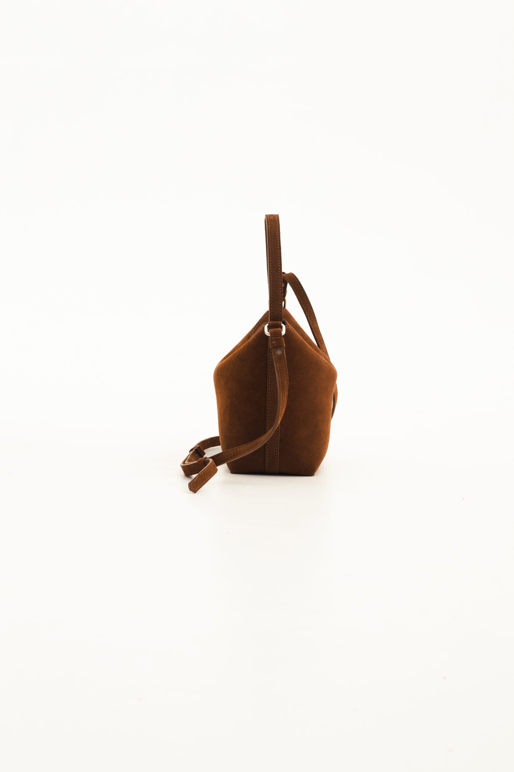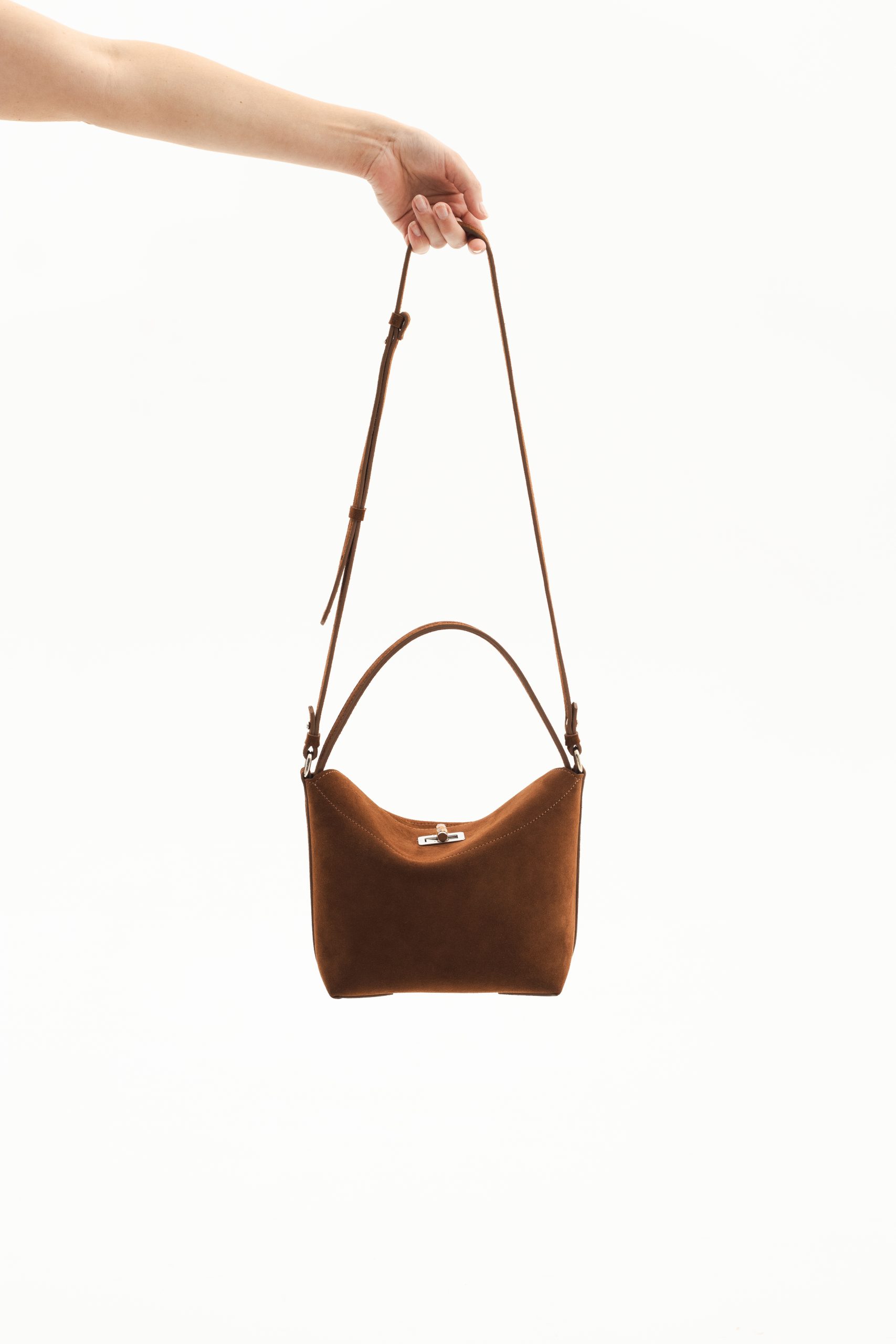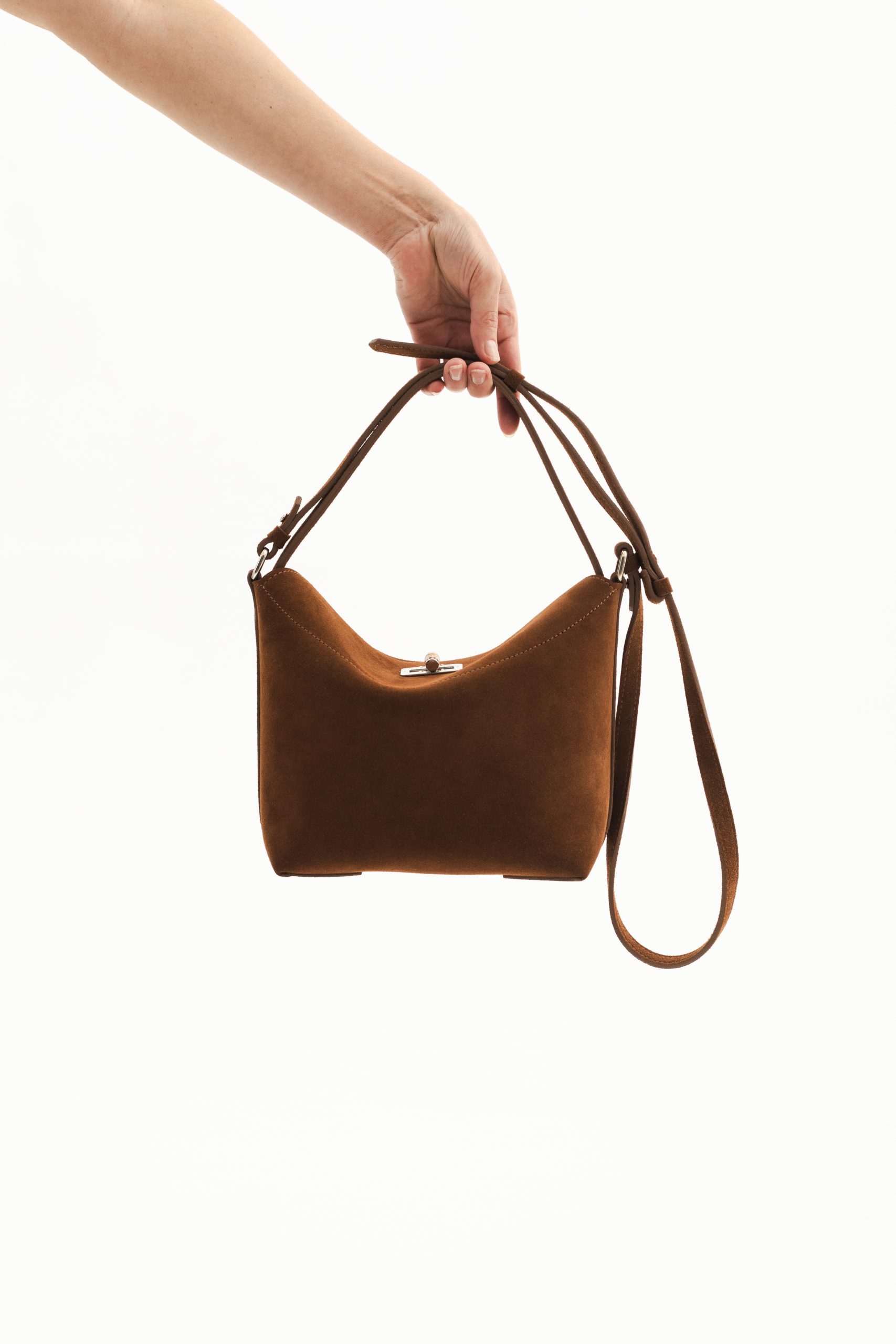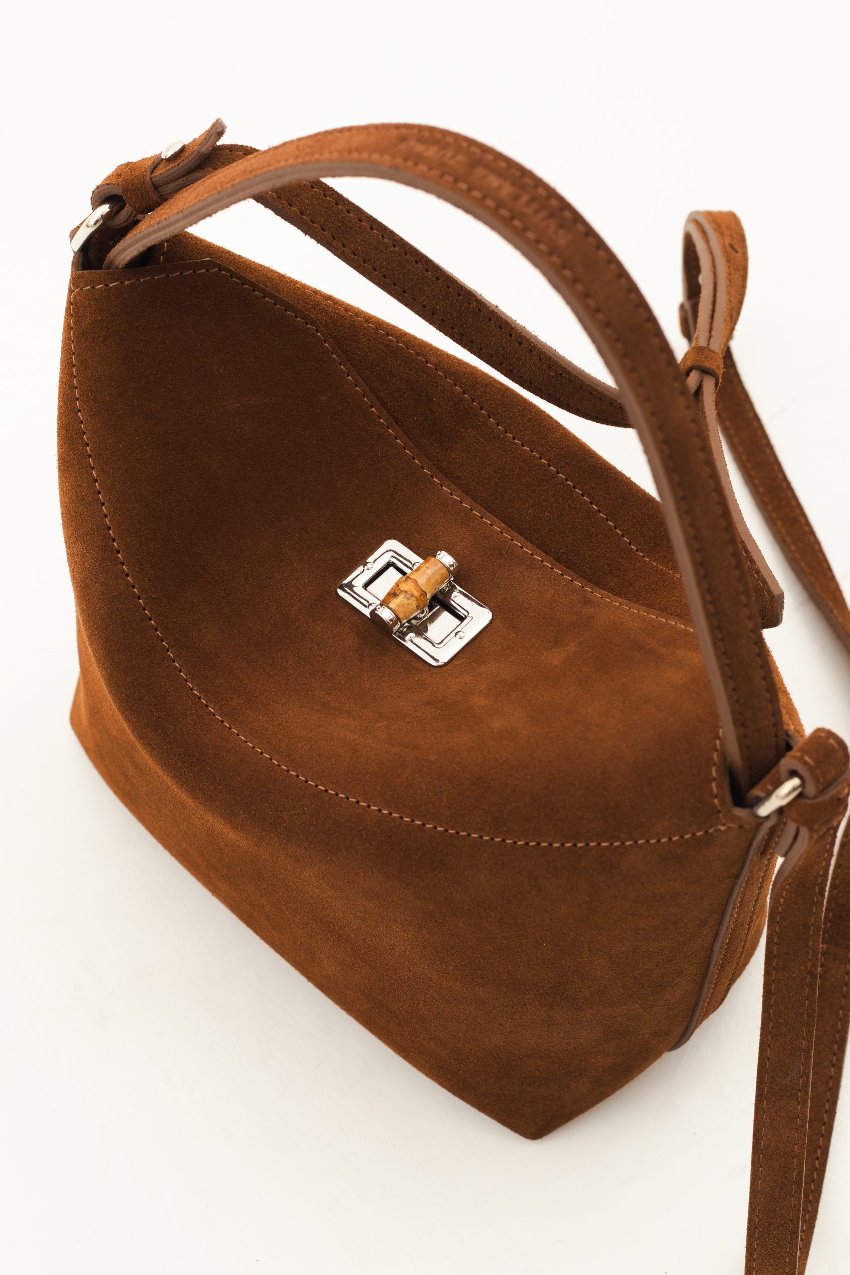 E S K E – cумка,яка закохує з першого погляду. Простота. М’яка текстура. Форма, що не потребує слів. Поворотна застібка з дерев’яною вставкою. Ремінець регулюється по довжині. Виготовлена з натуральної замші. Просторий внутрішній відділ та кишеня додають зручності цьому аксесуару.