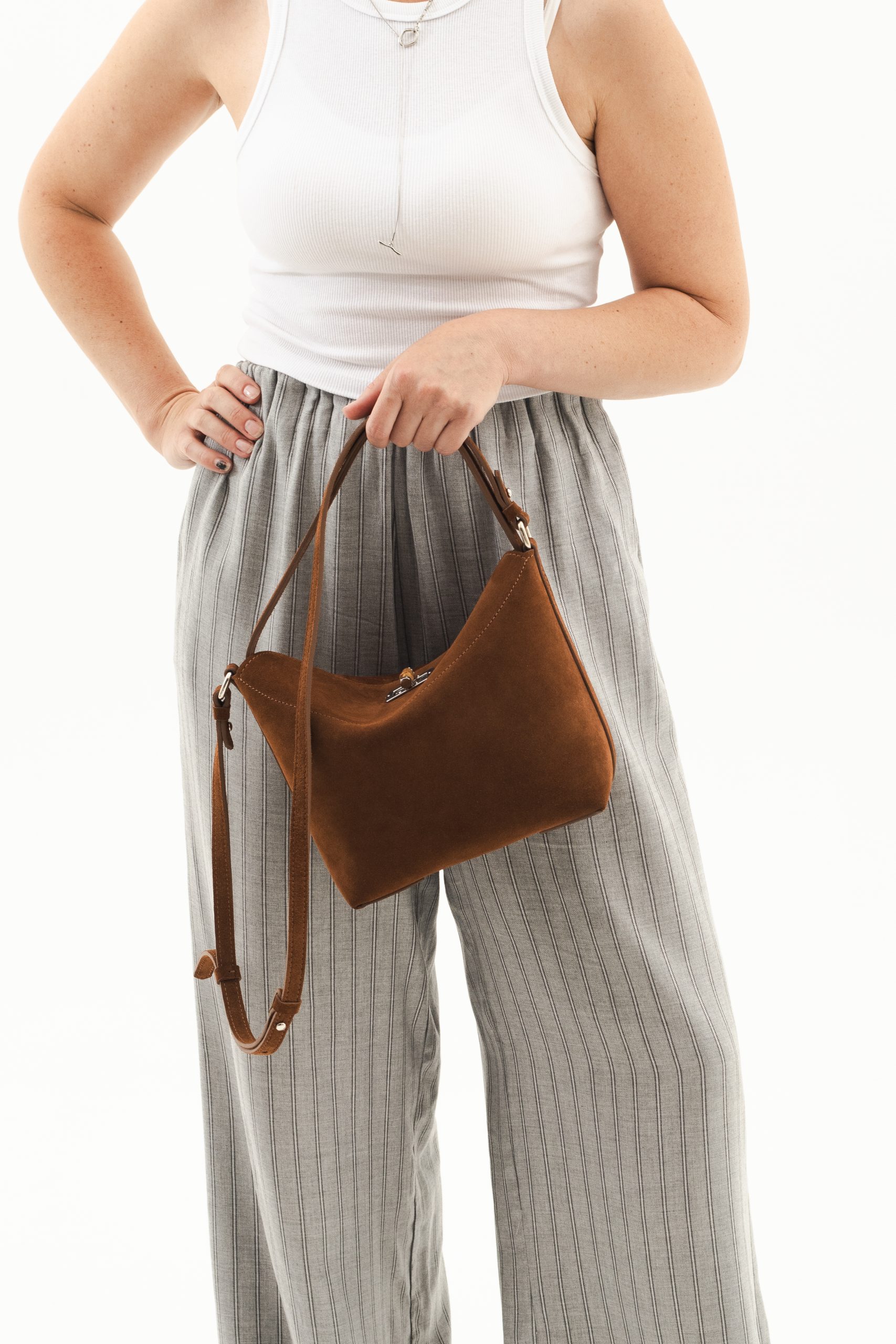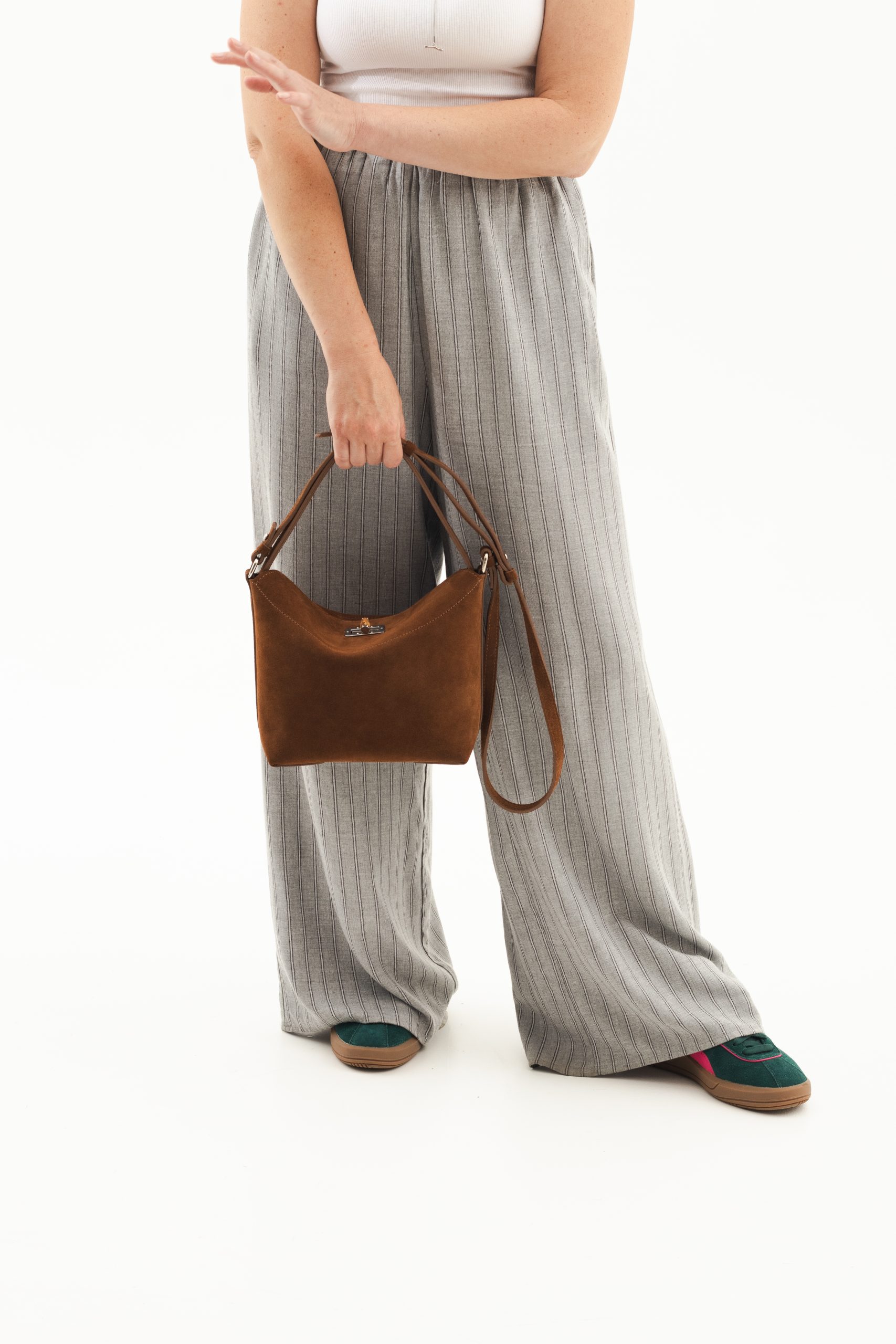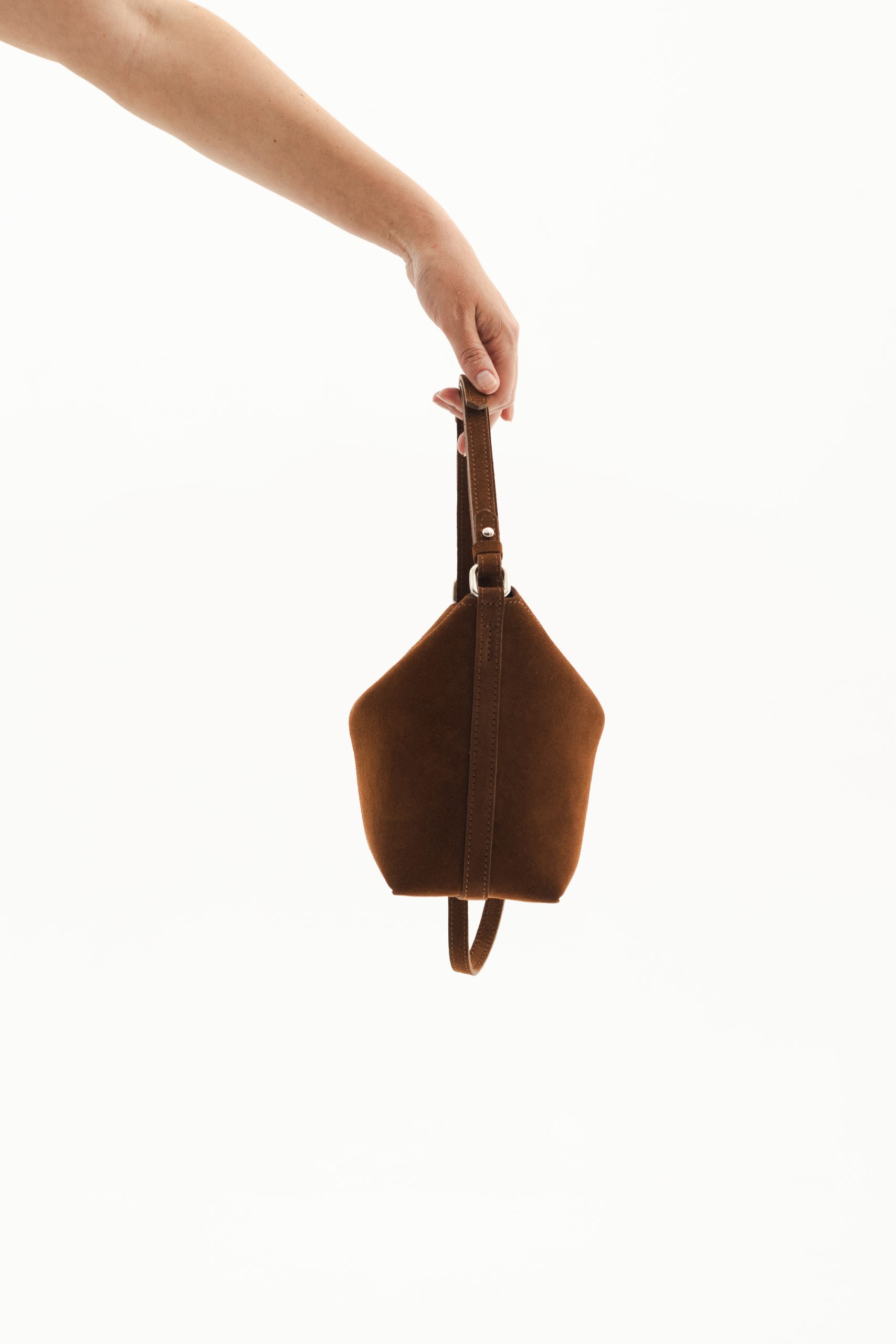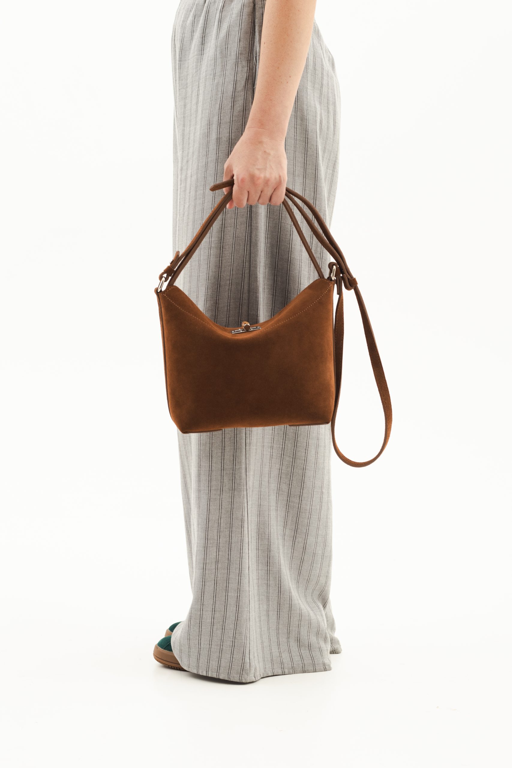 E S K E – cумка,яка закохує з першого погляду. Простота. М’яка текстура. Форма, що не потребує слів. Поворотна застібка з дерев’яною вставкою. Ремінець регулюється по довжині. Виготовлена з натуральної замші. Просторий внутрішній відділ та кишеня додають зручності цьому аксесуару.